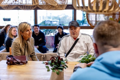 4 : Máxima gaat langs bij daklozenopvang: twee mannen verkiezen het curlen boven het bezoek van de koningin..